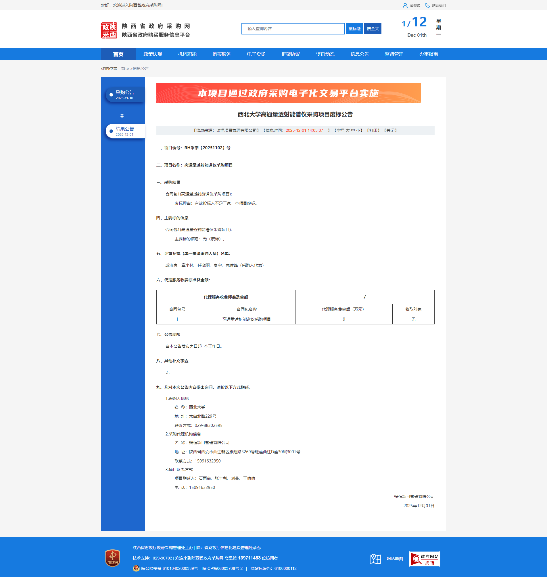 西北大学非标记生物膜干涉分析仪采购项目(二次)中标(成交)结果公告