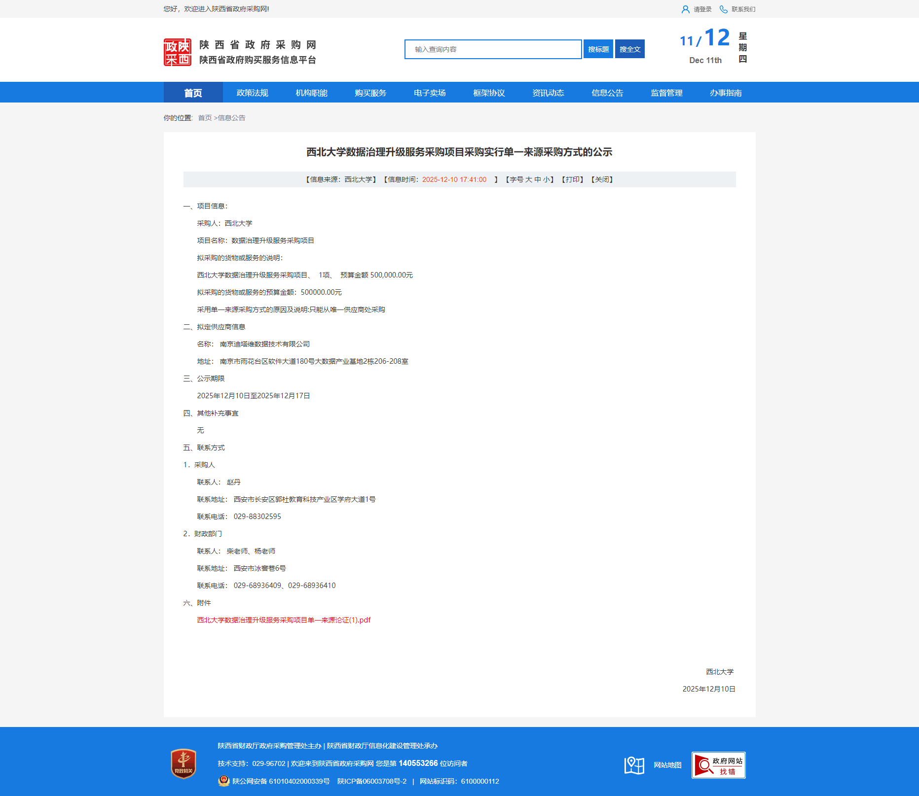 西北大学数据治理升级服务采购项目采购实行单一来源采购方式的公示