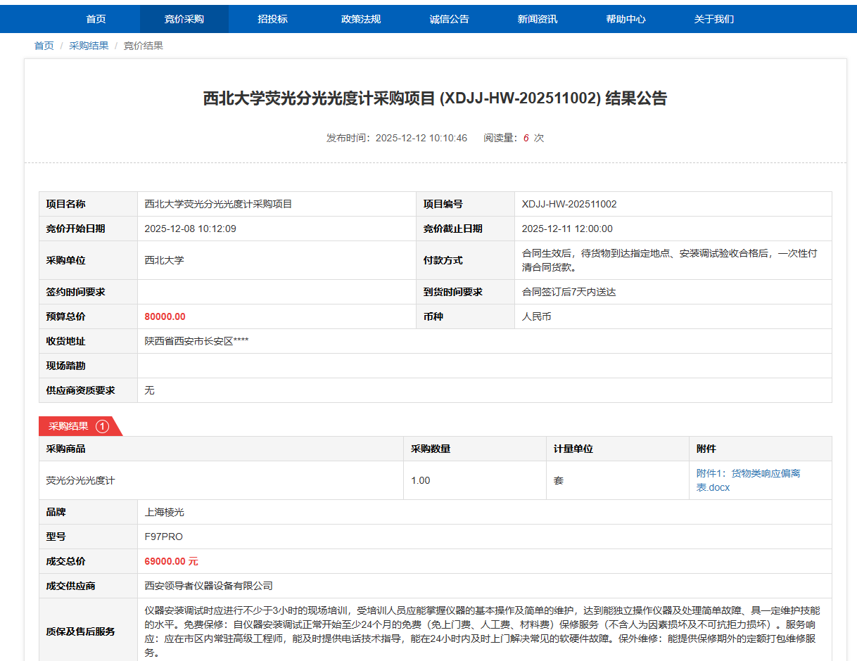 西北大学荧光分光光度计采购项目(XDJJ-HW-202511002)竞价结果公告