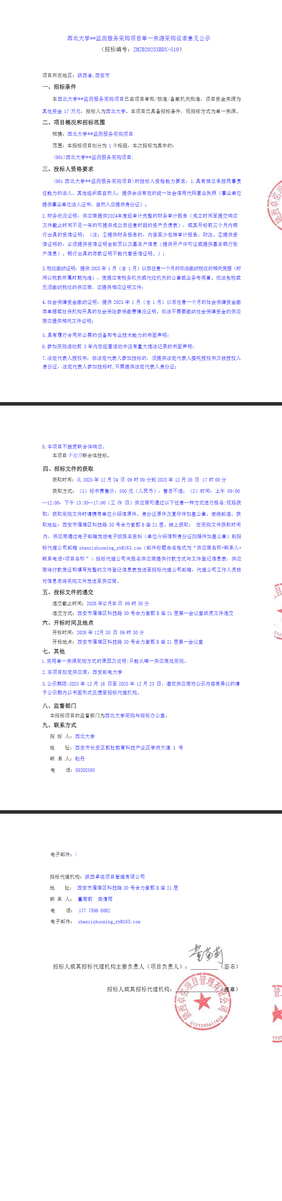 西北大学舆情监测服务采购项目单一来源采购征求意见公示