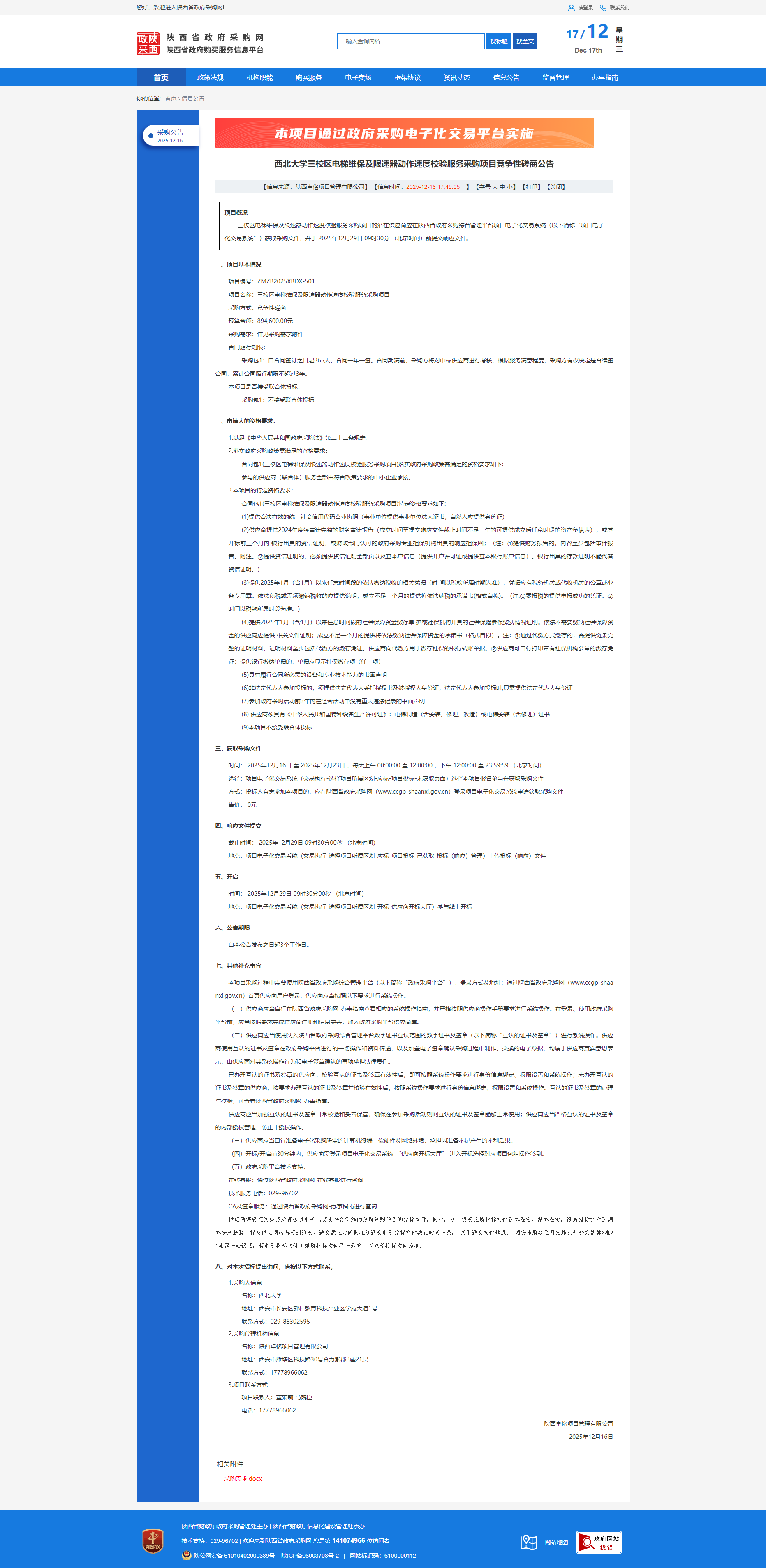 西北大学三校区电梯维保及限速器动作速度校验服务采购项目竞争性磋商公告