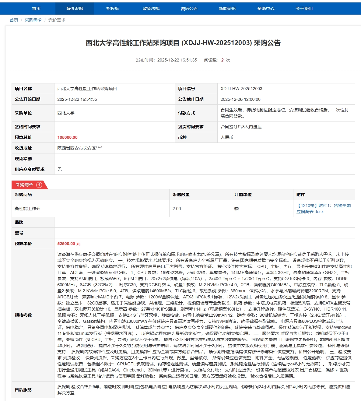 西北大学高性能工作站采购项目(XDJJ-HW-202512003)竞价采购公告