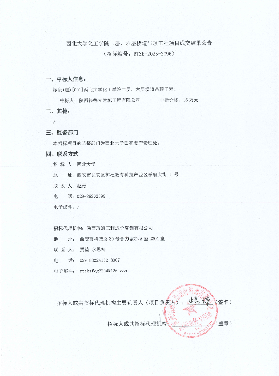 西北大学化工学院二层、六层楼道吊顶工程项目成交结果公告