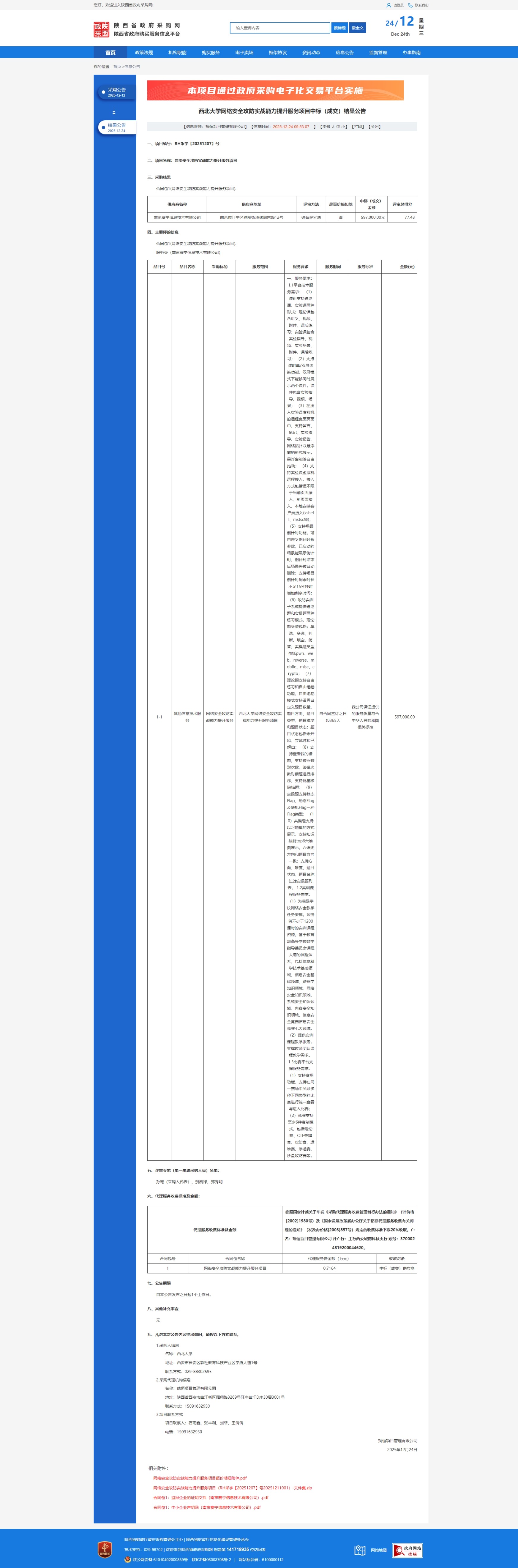 西北大学网络安全攻防实战能力提升服务项目中标(成交)结果公告 作者: 编辑:国有资产管理处 时间:2025-12-24 原公告链接:https://www.ccgp-shaanxi.gov.cn/freecms/site/shaanxi/ggxx/info/2025/8a69c45c9b320bee019b4e0a6acd20d2.html?noticeType=001026¬iceId=962bd69d-e06d-11f0-8063-08c0eb20c666