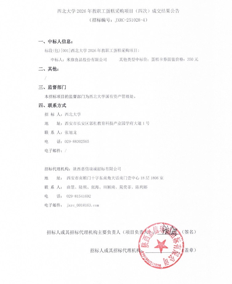 西北大学2026年教职工蛋糕采购项目(四次)成交结果公告