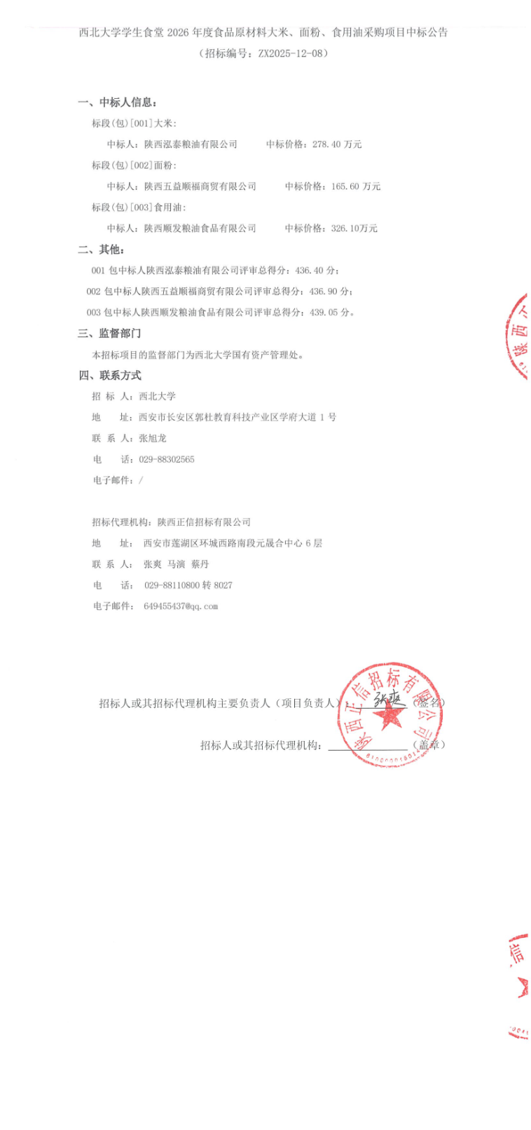 西北大学学生食堂2026年度食品原材料大米、面粉、食用油采购项目中标公告