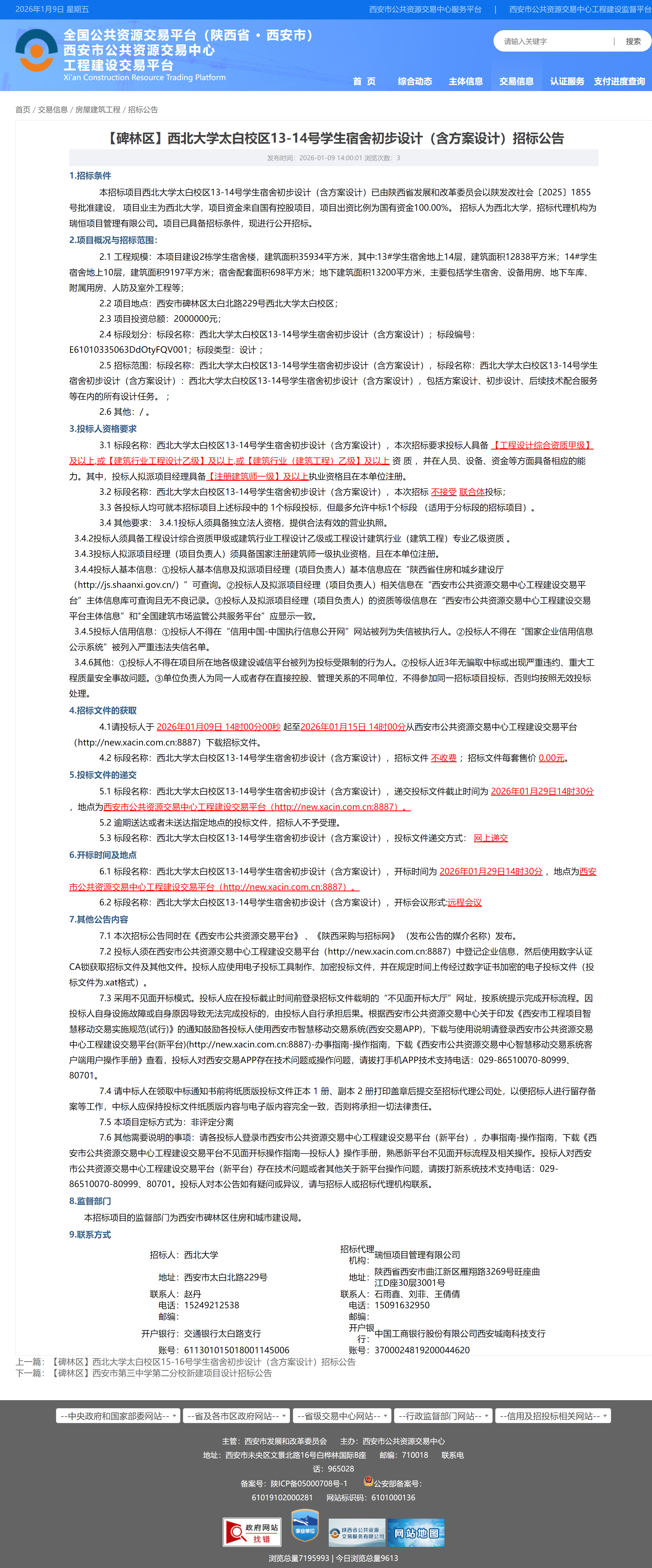 【碑林区】西北大学太白校区13-14号学生宿舍初步设计(含方案设计)招标公告