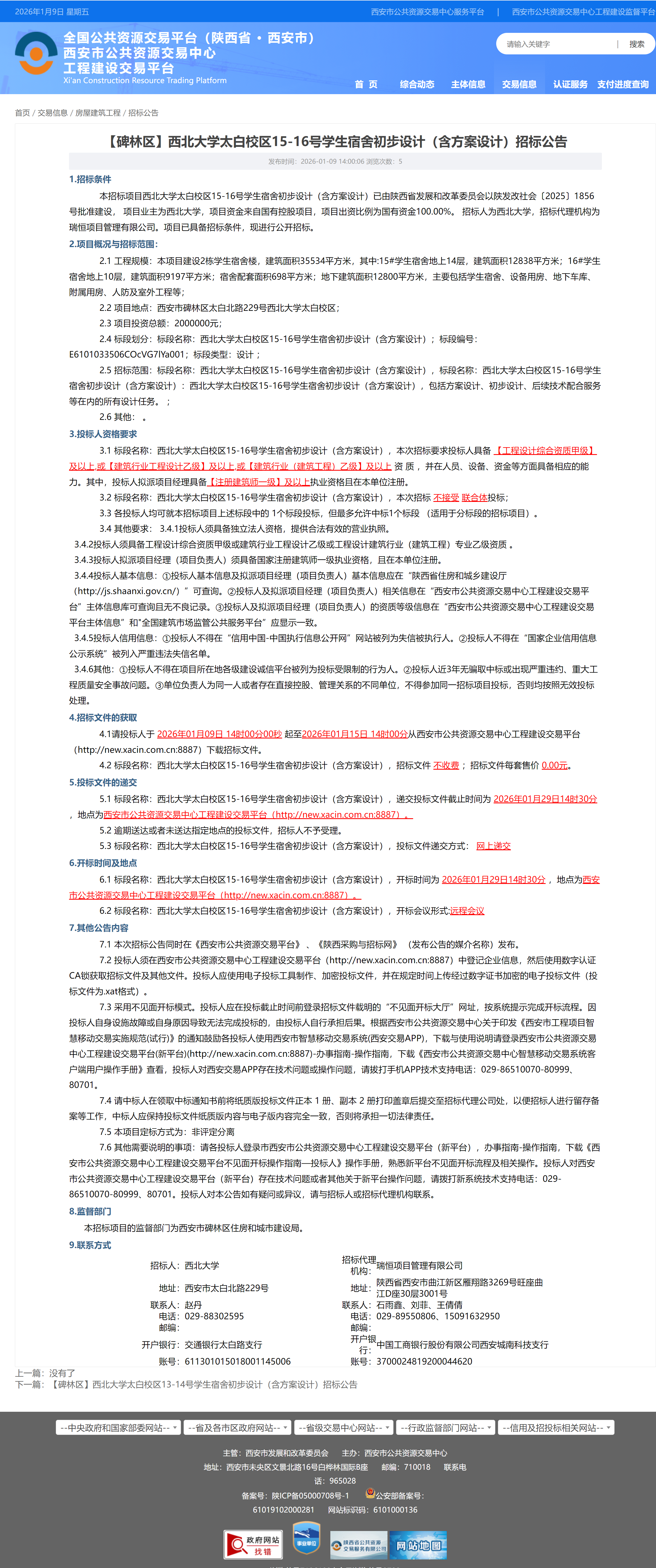 【碑林区】西北大学太白校区15-16号学生宿舍初步设计(含方案设计)招标公告