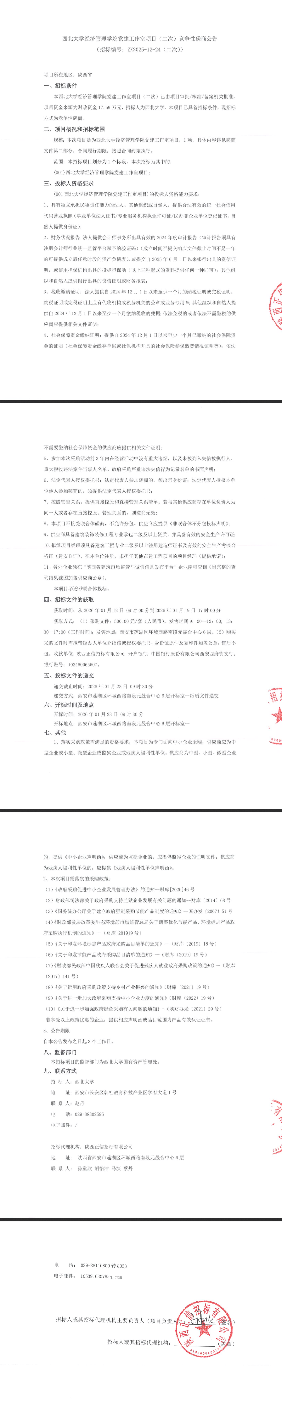西北大学经济管理学院党建工作室项目(二次)竞争性磋商公告 作者: 编辑:国有资产管理处 时间:2026-01-12 原公告链接:http://bulletin.sntba.com/biddingBulletin/2026-01-12/2162655.html