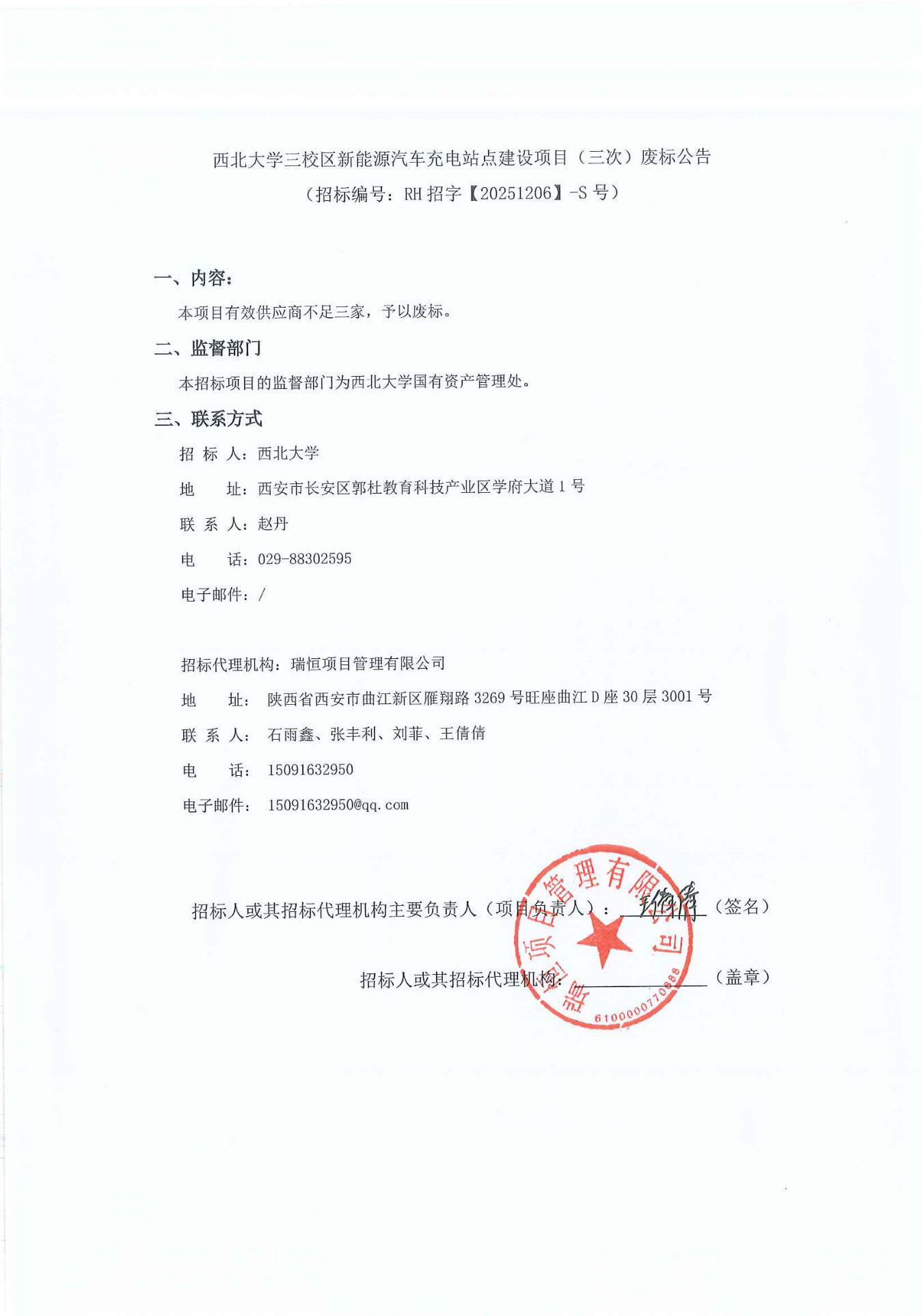 西北大学三校区新能源汽车充电站点建设项目(三次)废标公告