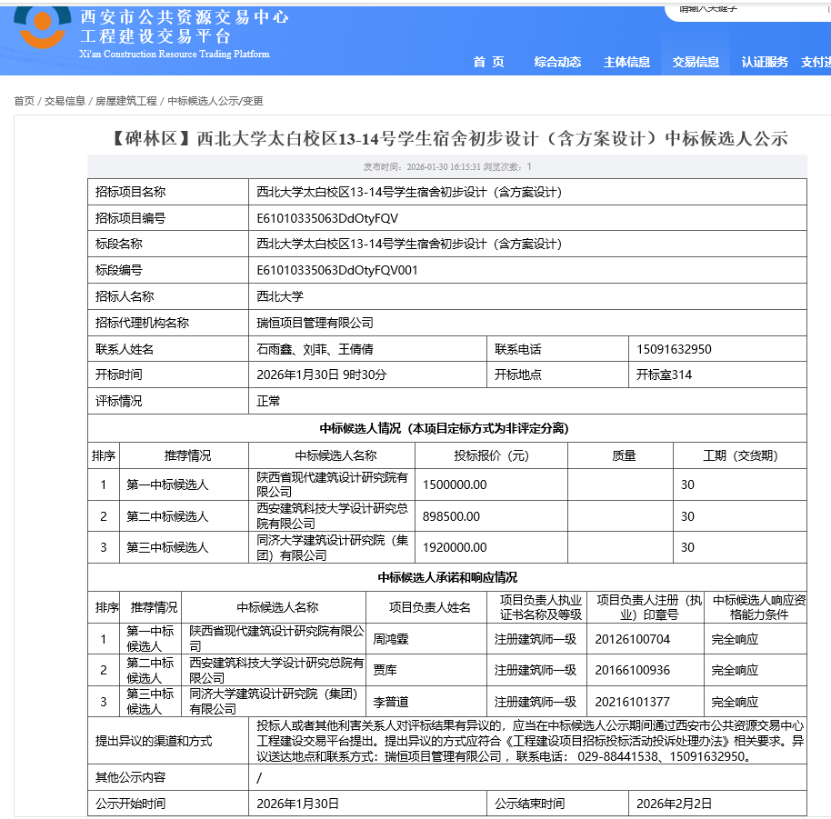 西北大学太白校区13-14号学生宿舍初步设计(含方案设计)中标候选人公示